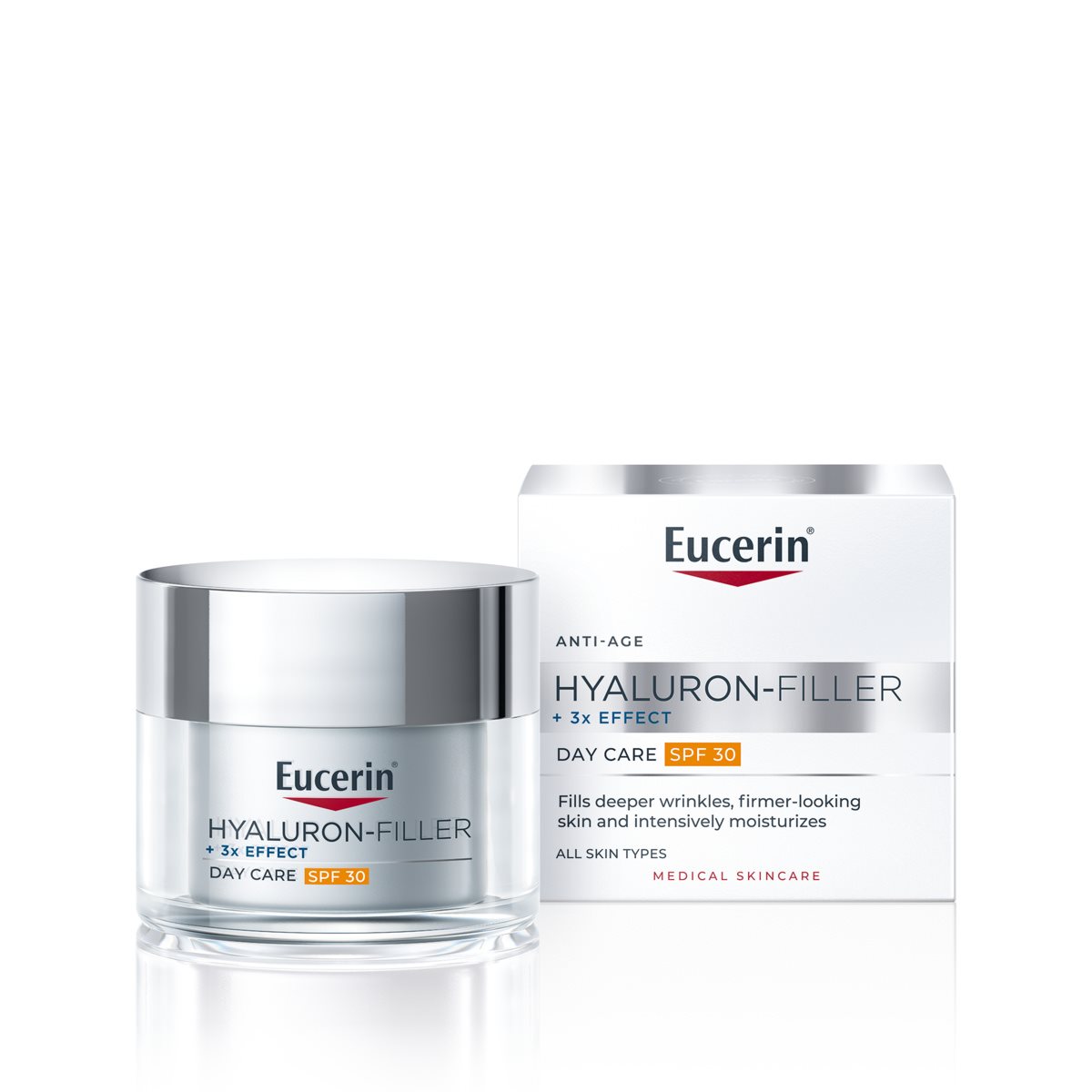Igapäevane kokkupuude UV-kiirgusega kiirendab naha vananemist, mistõttu on SPF-kaitse hädavajalik – kuid mõned päikesekaitsekreemid võivad naha kuivaks muuta. Eucerin Hyaluron-Filler 3x Effect päevakreem SPF 15 kuivale nahale pakub laiaulatuslikku niisutust ja päikesekaitset ühes tootes, kaitstes fotovananemise eest ja lukustades niiskuse naha sisse, hoides selle päeva jooksul sileda, pinguloleva ja kaitstuna.